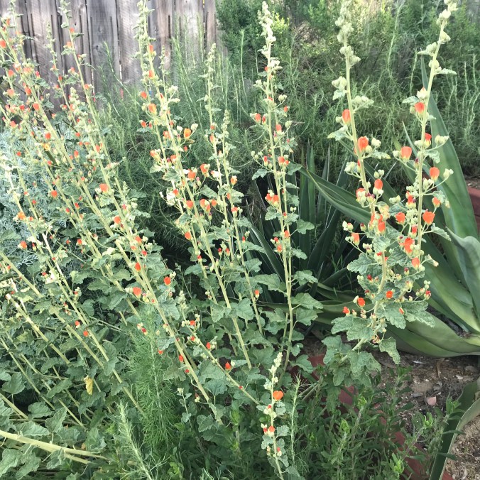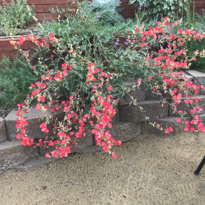 But the name of the game right now in April in my garden is mallow, as in globe mallow, Sphaeralcea ambigua. I’ve got it in red (Louis Hamilton, shown below)….