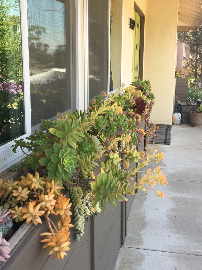 As a parting shot — here are the front window boxes. These succulents are going crazy with flowering this spring. These boxes were already overgrown: now I really know I need to clean them out and replant them. Maybe in May….