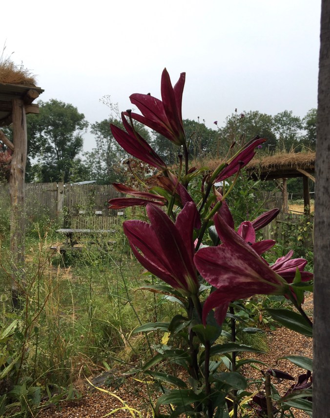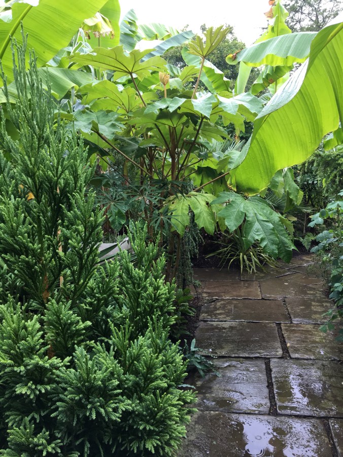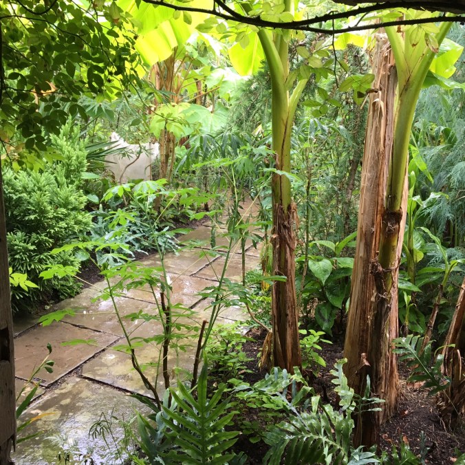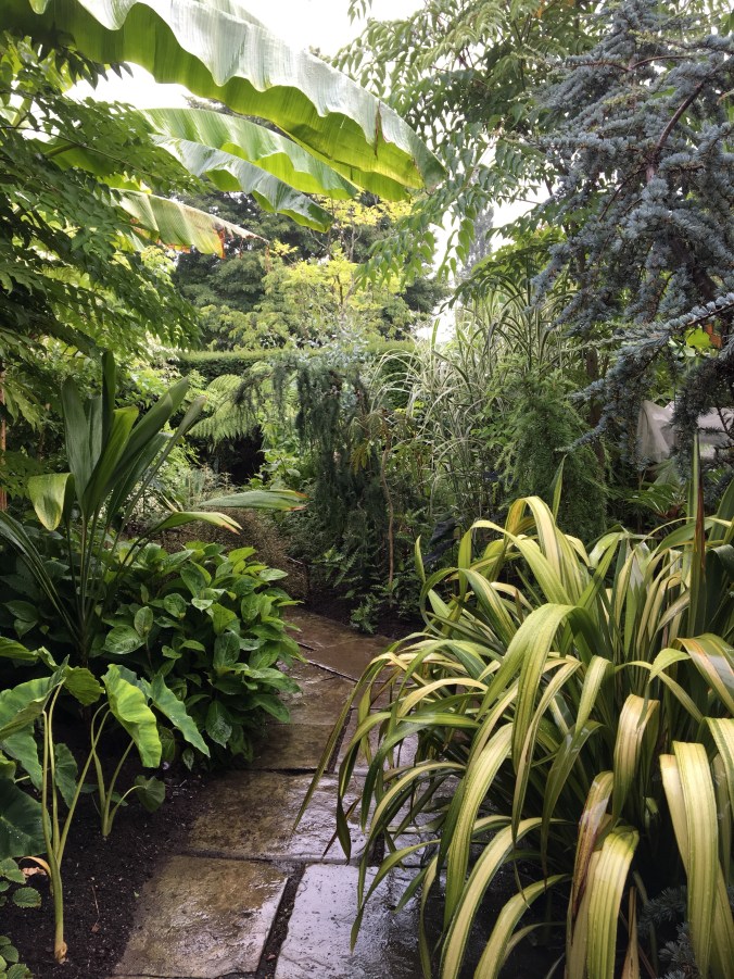 … and headed to the Exotic Garden as the rain really started to set in. You can see the Exotic Garden’s bananas and other jungle-y plants poking up above the yew hedge.